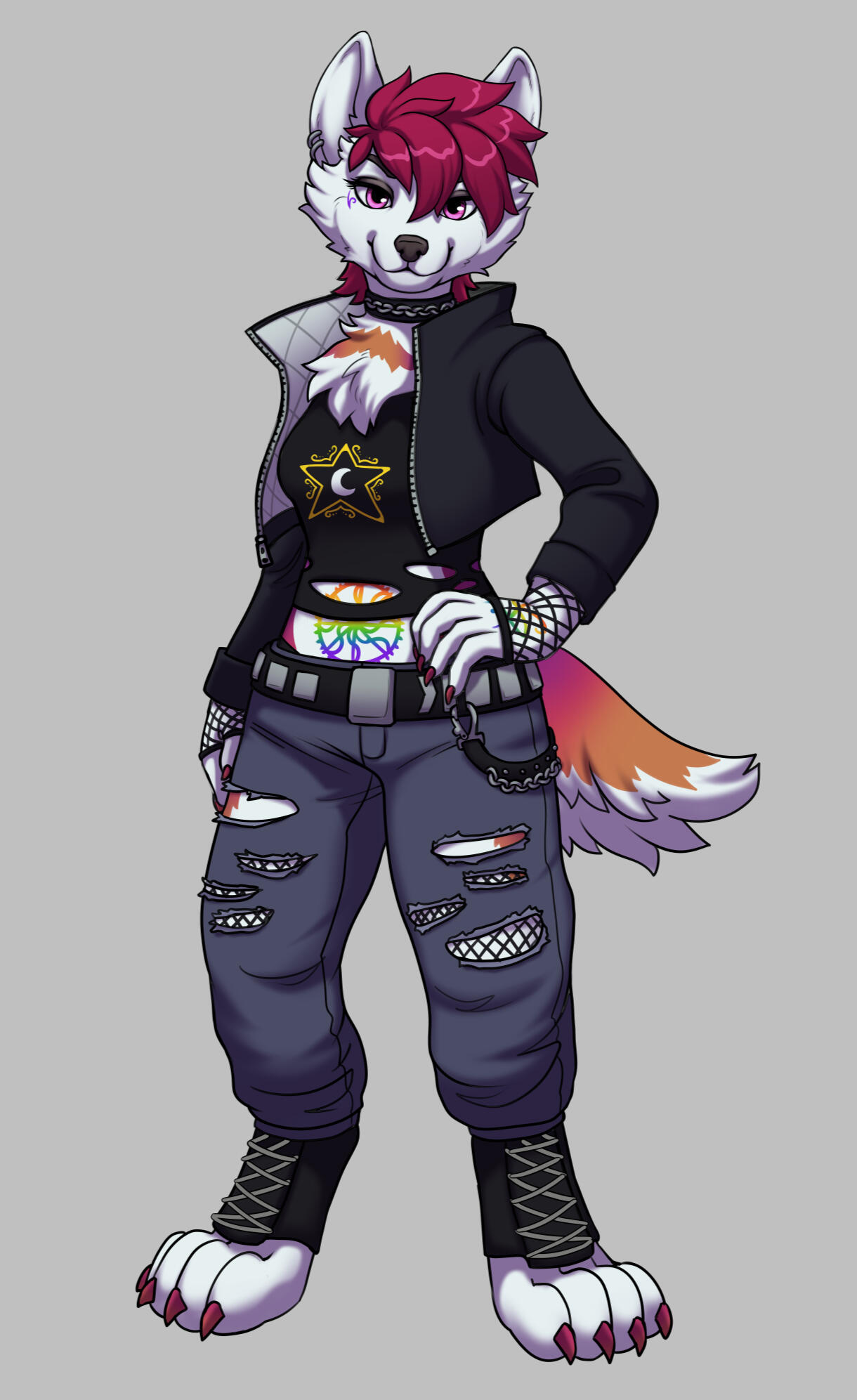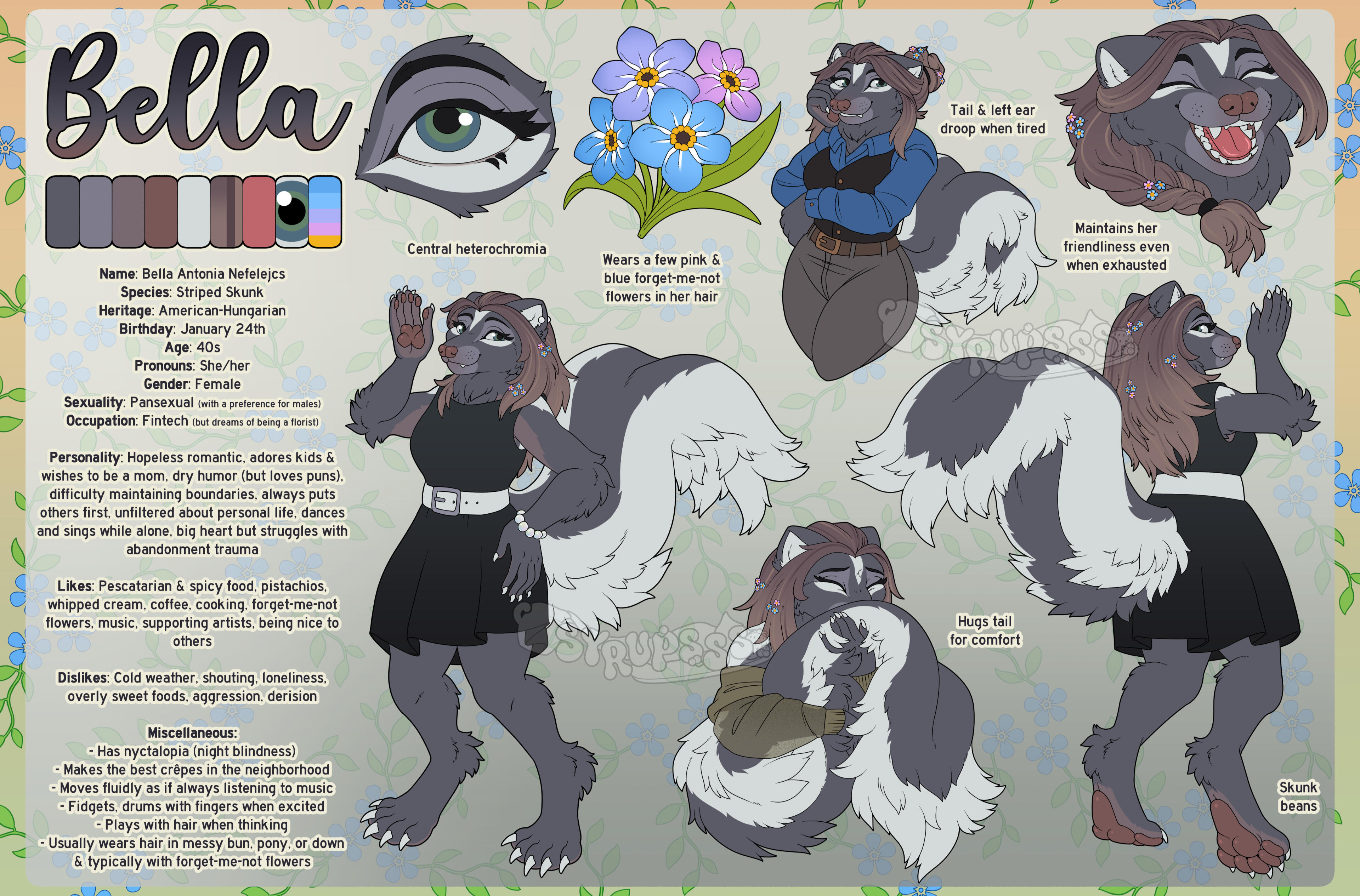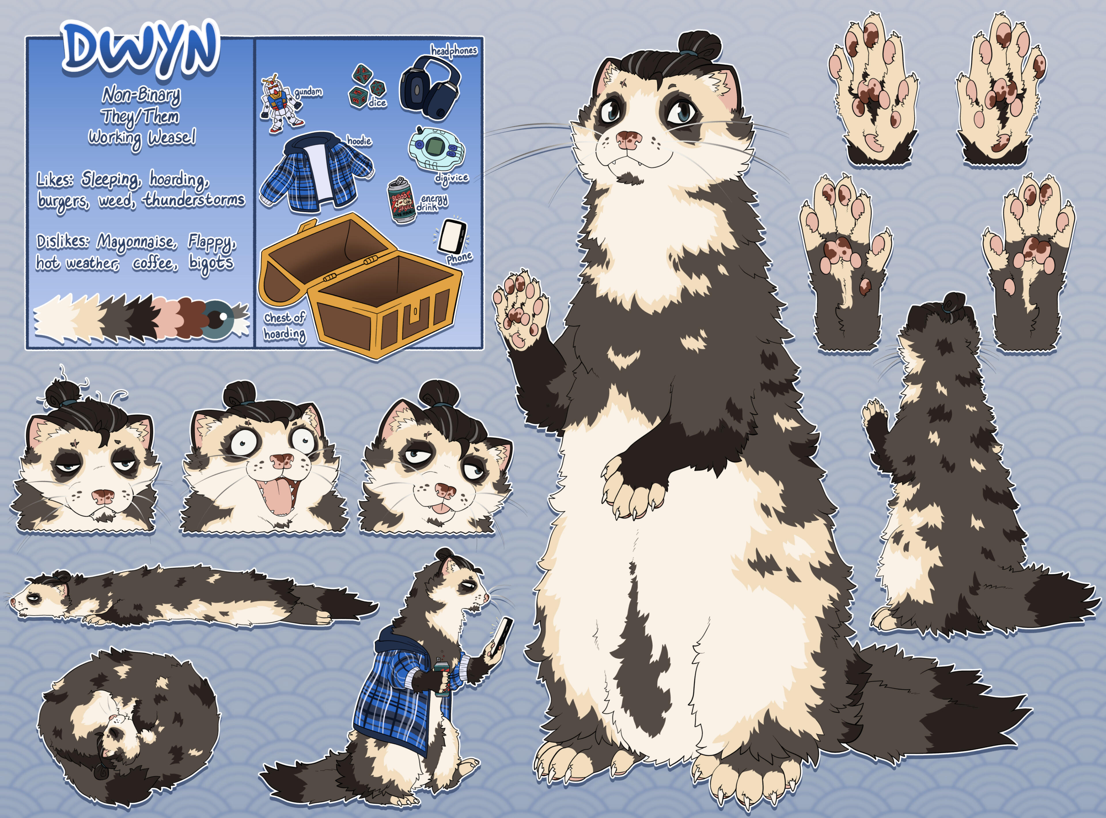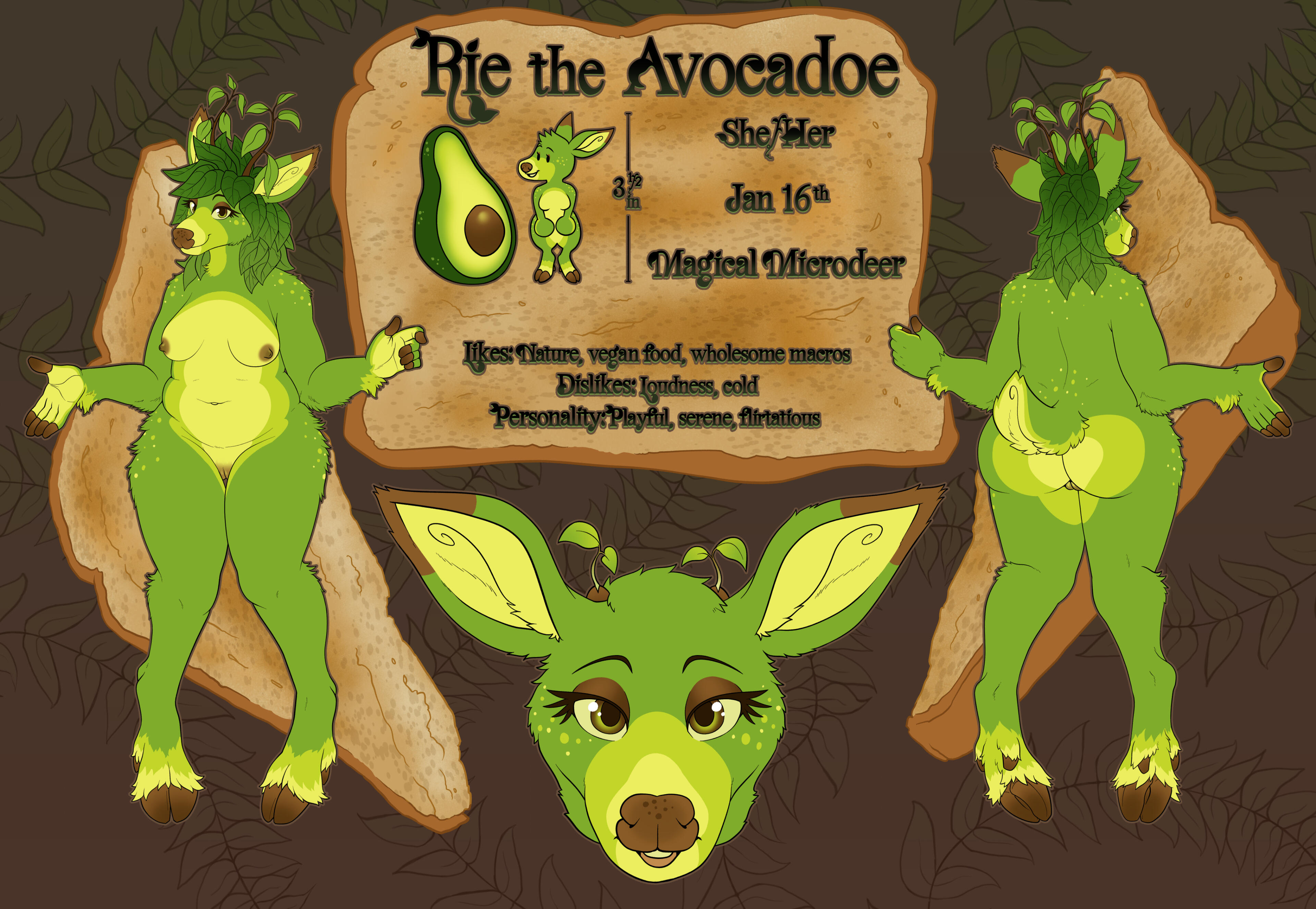 A reference sheet of your character with as much or as little additional information as you want, such as lore, species, age, birthday, pronouns, accessories, and more. This can be a half ref sheet (one full body and two detail shots) or a full ref sheet (two full bodies and two detail shots).Half Ref Sheet || 250USD